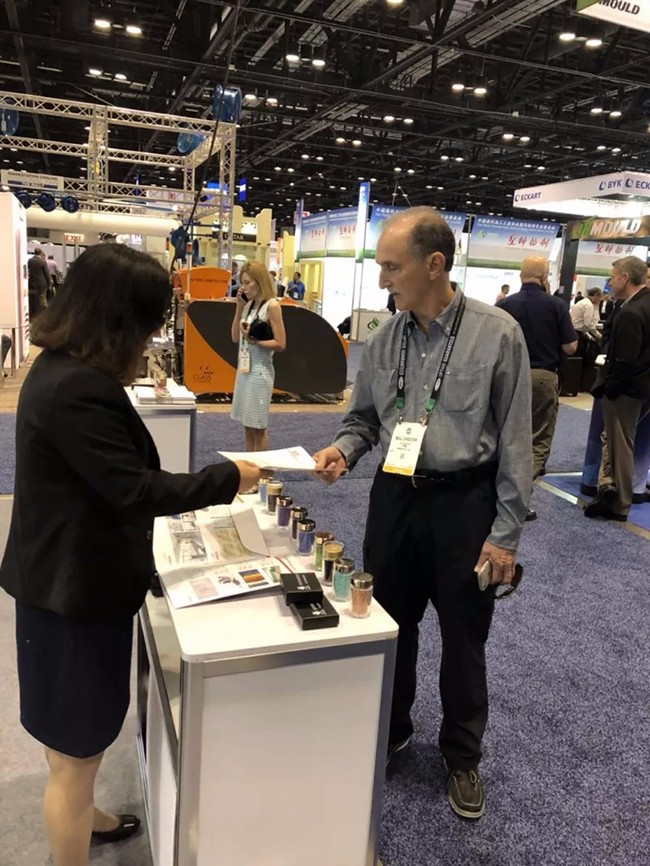 ▲ 現(xiàn)場(chǎng),紅梅色母料受到了外國(guó)客戶的高度認(rèn)可,紅梅工作人員的熱情和專業(yè)以及環(huán)保無(wú)味、性能穩(wěn)定、亮度高、分散好、色譜全的母料產(chǎn)品,吸晴無(wú)數(shù)!